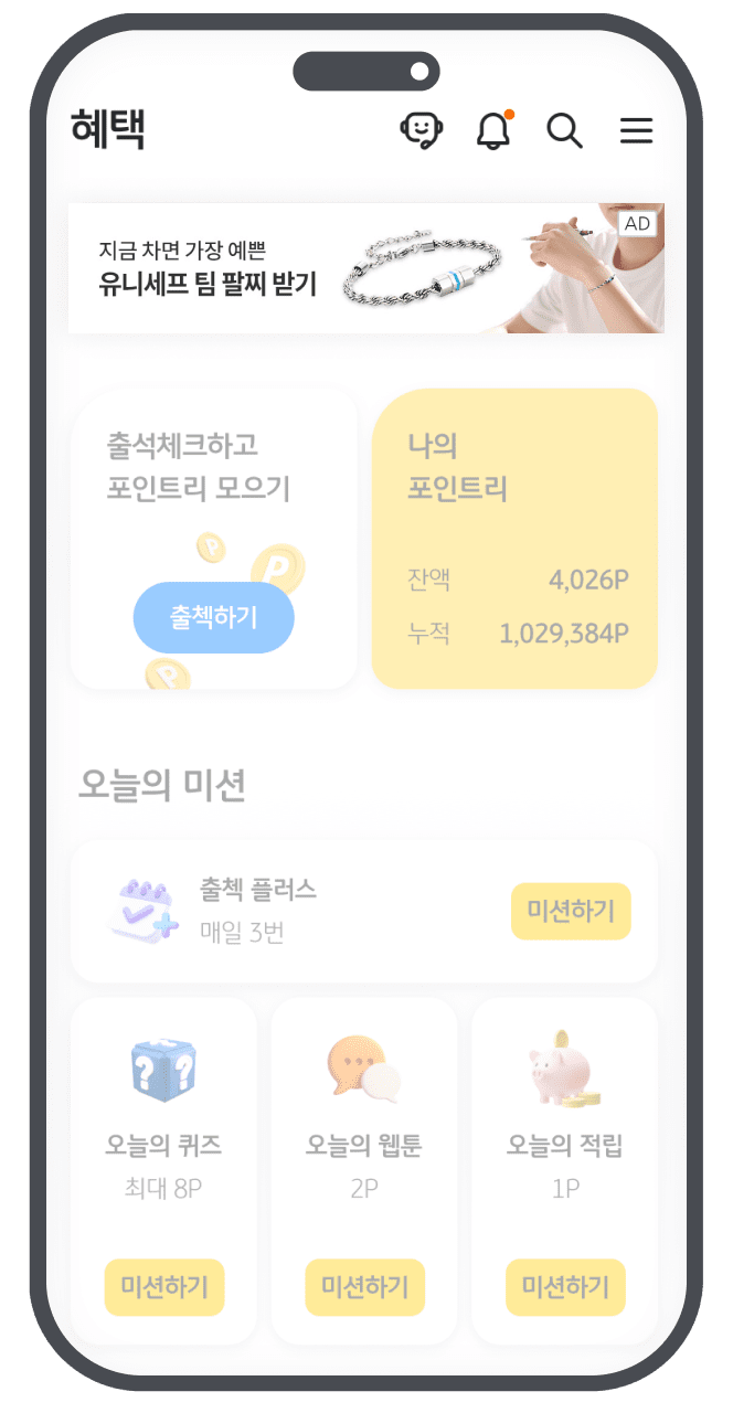 미션 기반 리워드가 제공되는 화면으로 매일 고정된 노출량과 클릭 확보에 용이해요