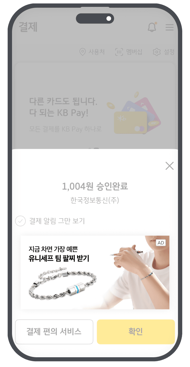 KB Pay 실행 시 오픈되는 고정 화면으로 노출량을 극대화 할 수 있어요