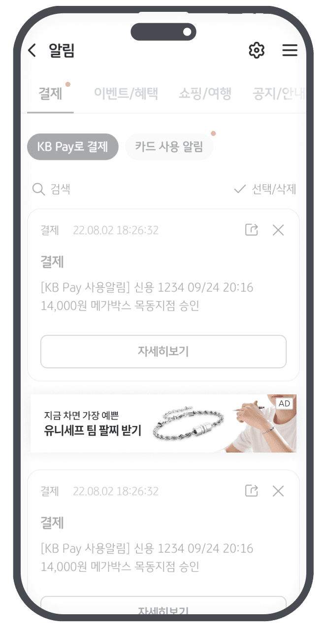 결제 이력 및 마케팅 혜택을 안내하는 알림함을 통해 노출 빈도를 높여 보세요